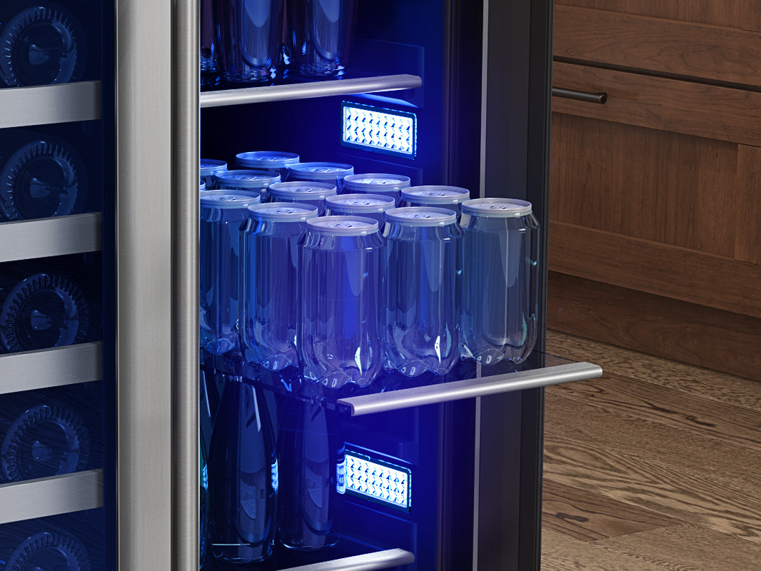 The Presrv™ French Door Wine & Beverage Cooler is the ultimate in sophisticated home party accessories, ready to store wine, beer, sodas and more. This large capacity cooler maintains two distinct temperature zones with PreciseTemp™ temperature control, Active Cooling Technology and boasts loads of other features — from an updated kickplate with lock to Full-Extension Wood Racks to a Vibration Dampening System, and more. Set the vibe for any gathering with an illuminated control panel and dual-level 3-Color LED lighting.