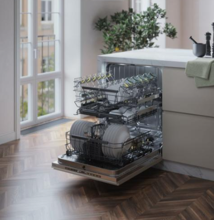 60 Series, fully integrated XXL dishwasher tested for 20 years of use with a three-level Flexi Racks™ system, a low noise level (39 dB), Status Light™, Turbo Combi Drying™, Auto Dose, push-to-open door and connectivity. The Adjustable power zones and the effective Super Cleaning System™ ensure perfectly clean dishes.
