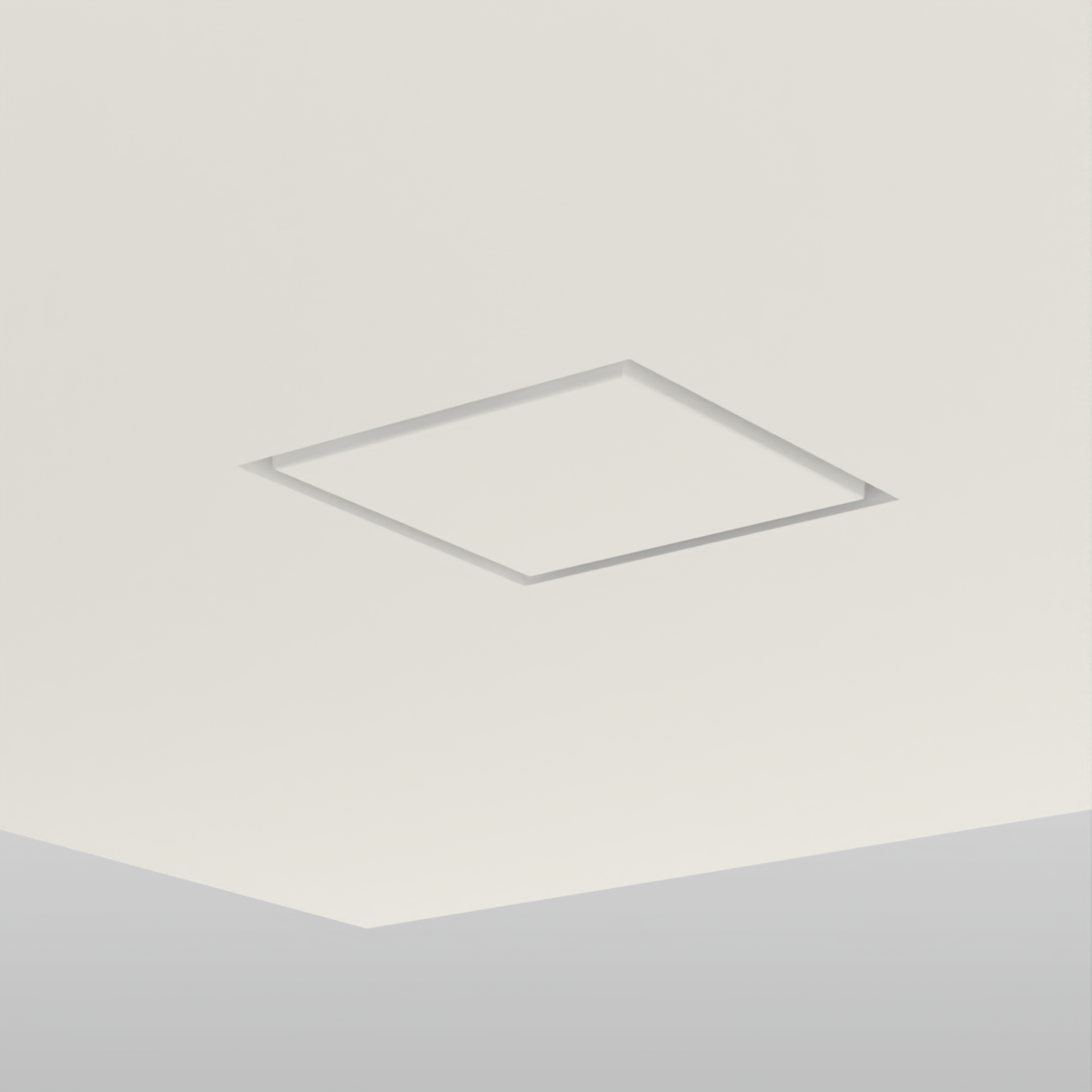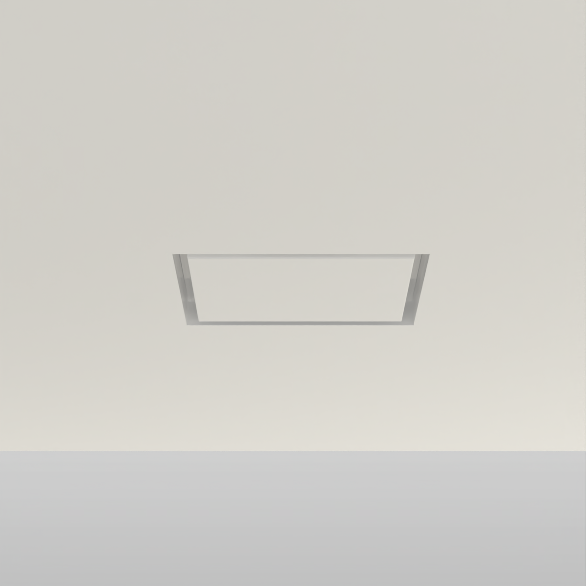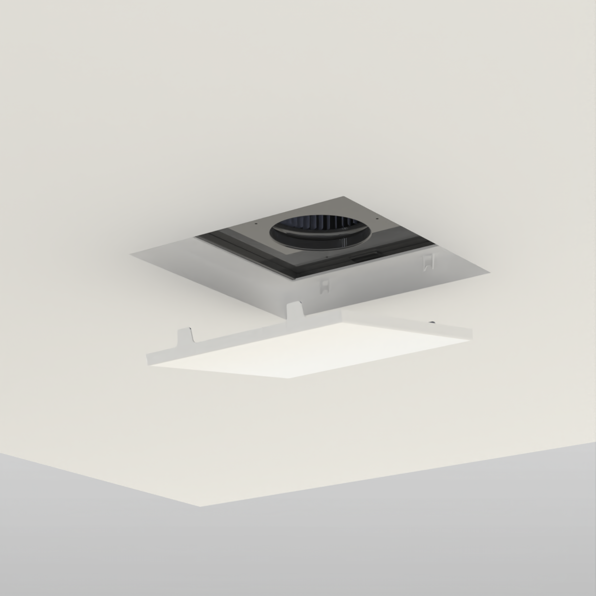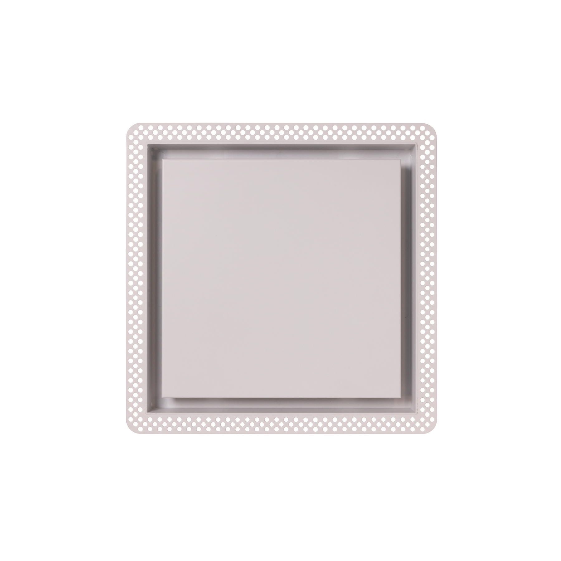 Price-conscious, ultra-minimal exhaust fan mount and cover, equipped with a light-weight ABS plastic drywall bead that contours seamlessly into the drywall surface.