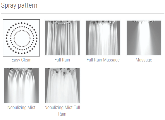 • Spray Patterns: Full Rain, Full Rain Massage, Massage, Nebulizing Mist & Nebulizing Mist Full Rain