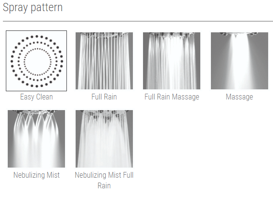 • Spray Patterns: Full Rain, Full Rain Massage, Massage, Nebulizing Mist, Nebulizing Mist Full Rain